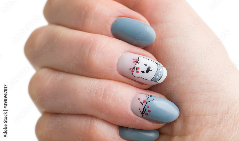Nails Design. Hands With Snowman. Christmas blue Manicure isolated